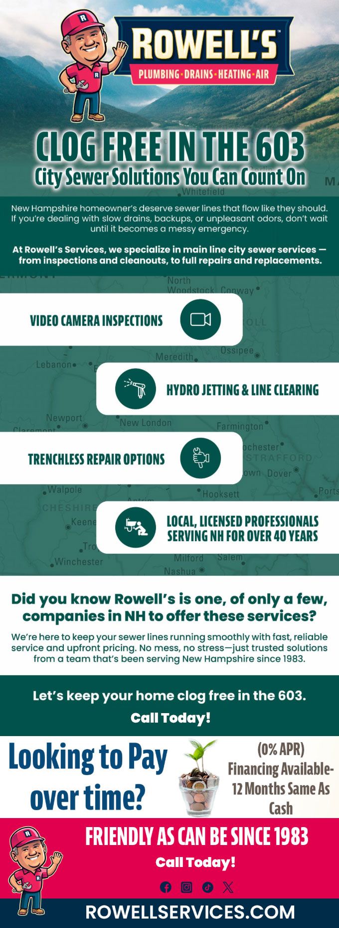 At Rowell's Services, we specialize in main line city sewer services — from inspections and cleanouts, to full repairs and replacements.