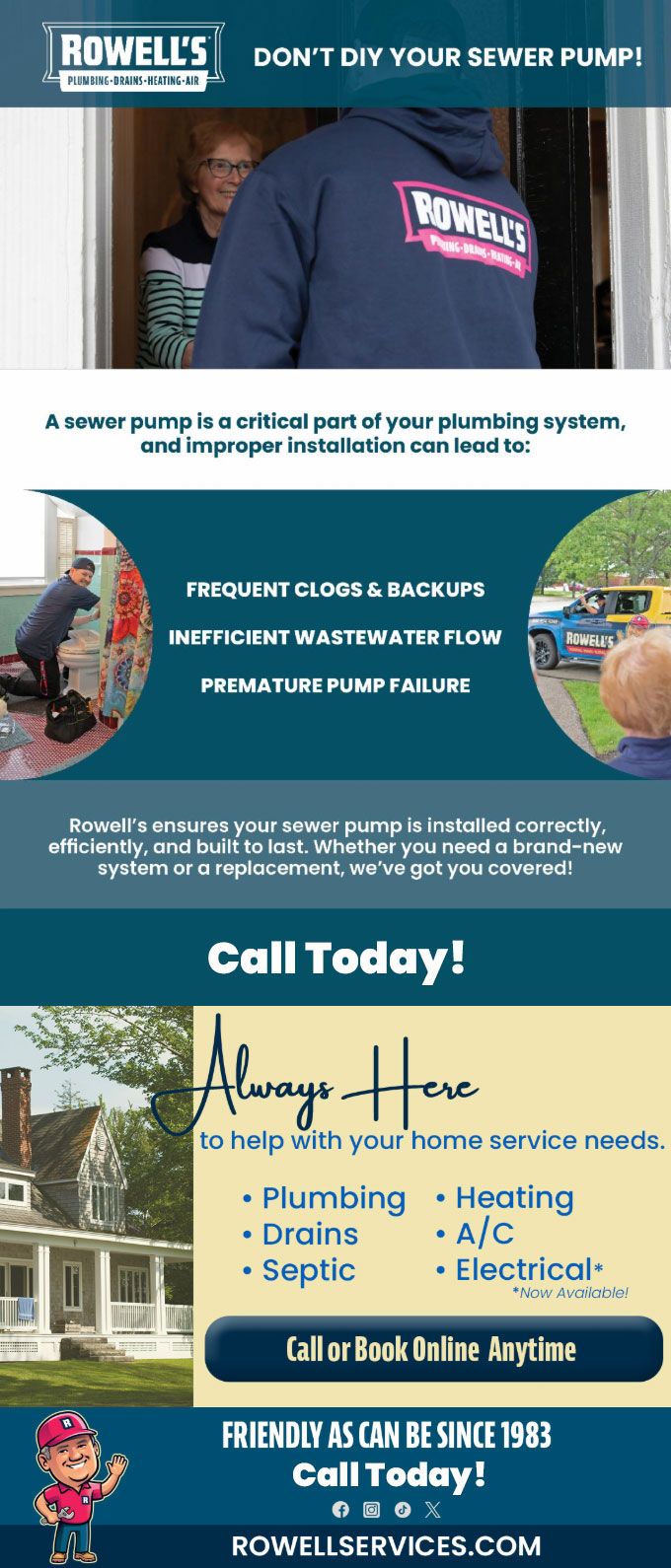 "Friendly As Can Be Since 1983!" When you need help with your plumbing, drains, heating, cooling or electrical in Deerfield, you can always rely on Rowell's Services! Call us now or book online!