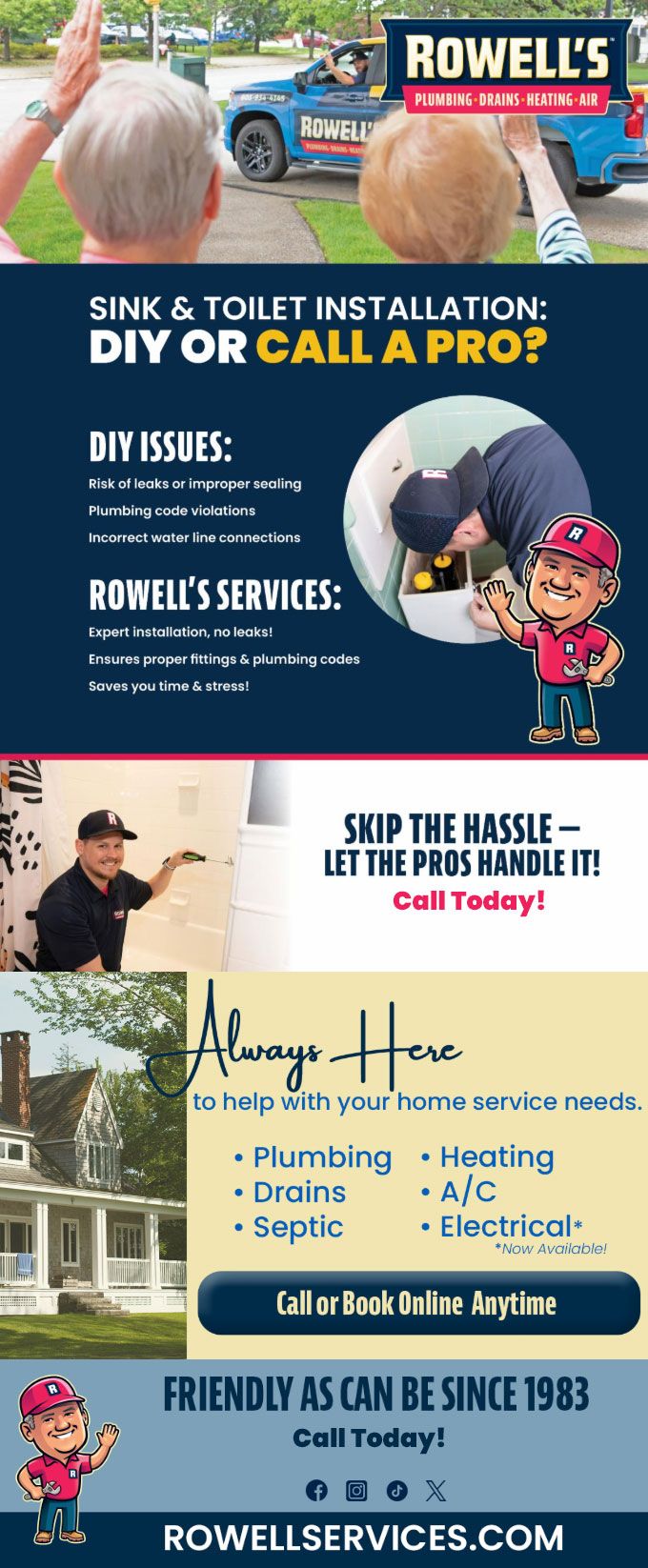 "Friendly As Can Be Since 1983!" When you need help with your plumbing, drains, heating, cooling or electrical in Deerfield, you can always rely on Rowell's Services! Call us now or book online!